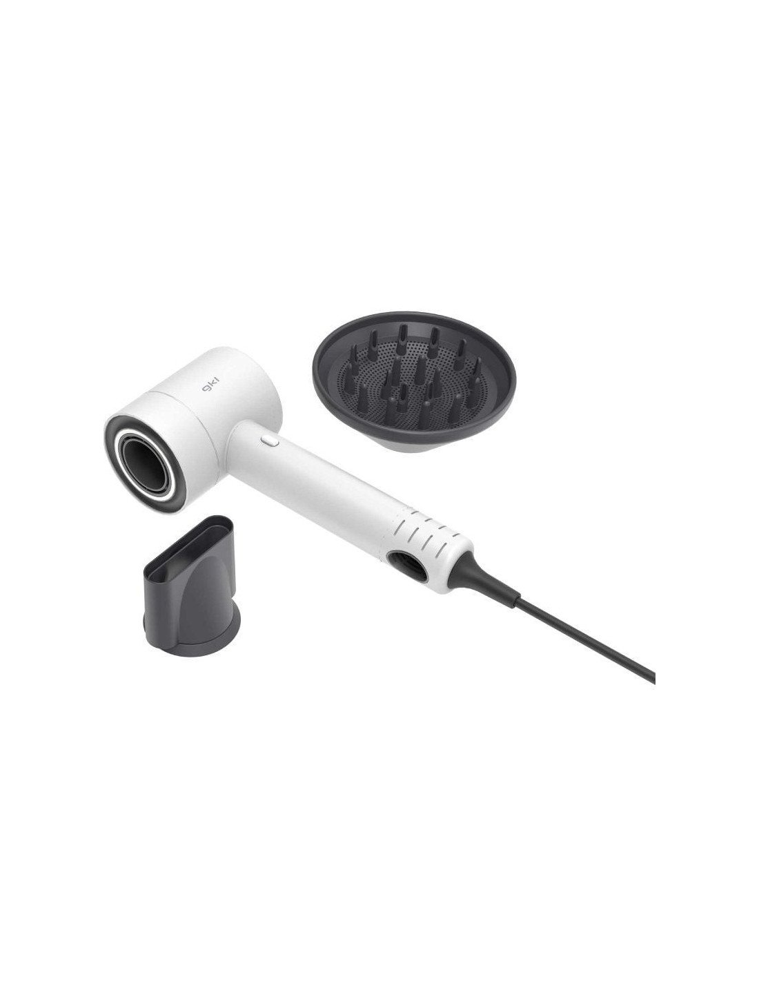 Secador de pelo iónico blanco con una potencia de 1600W, el motor DC sin escobillas y tecnología iónica. Tiene 3 niveles de velocidad y 4 niveles de temperatura con función de aire frío. Su diseño es ultraligero con filtro desmontable. Incluye concentrador y difusor.