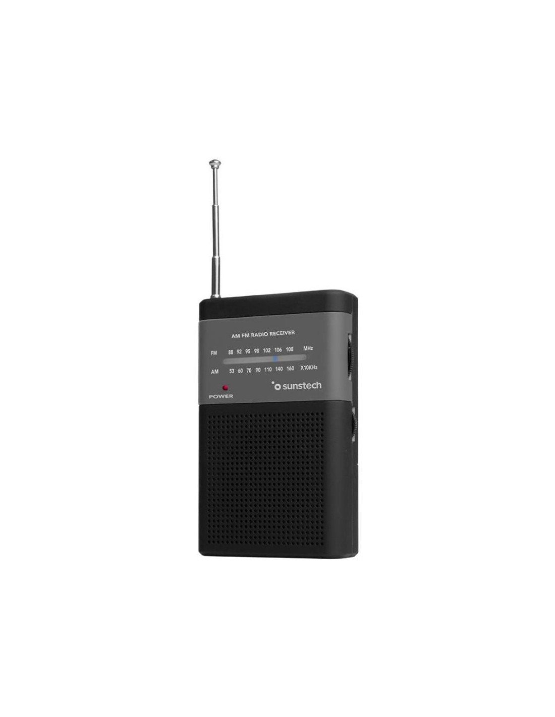 Radio analógica de bolsillo con altavoz, salida para auriculares y antena telescópica.